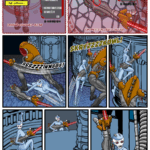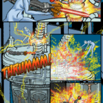 Angie emerges atop the ophan carrying the enormous arm torn from the armored guard that defends the powered structure. Grasping the guards arm tightly, Angie aims the high tech appendage and its glowing amber energy blade at the conduit that connects the ophan to the network. They swing the weapon slicing through the massive mechanical conduit, sending sparks and molten fragments flying. The sound effect “SHRAKKK!” bursts across the panel, emphasizing the impact.