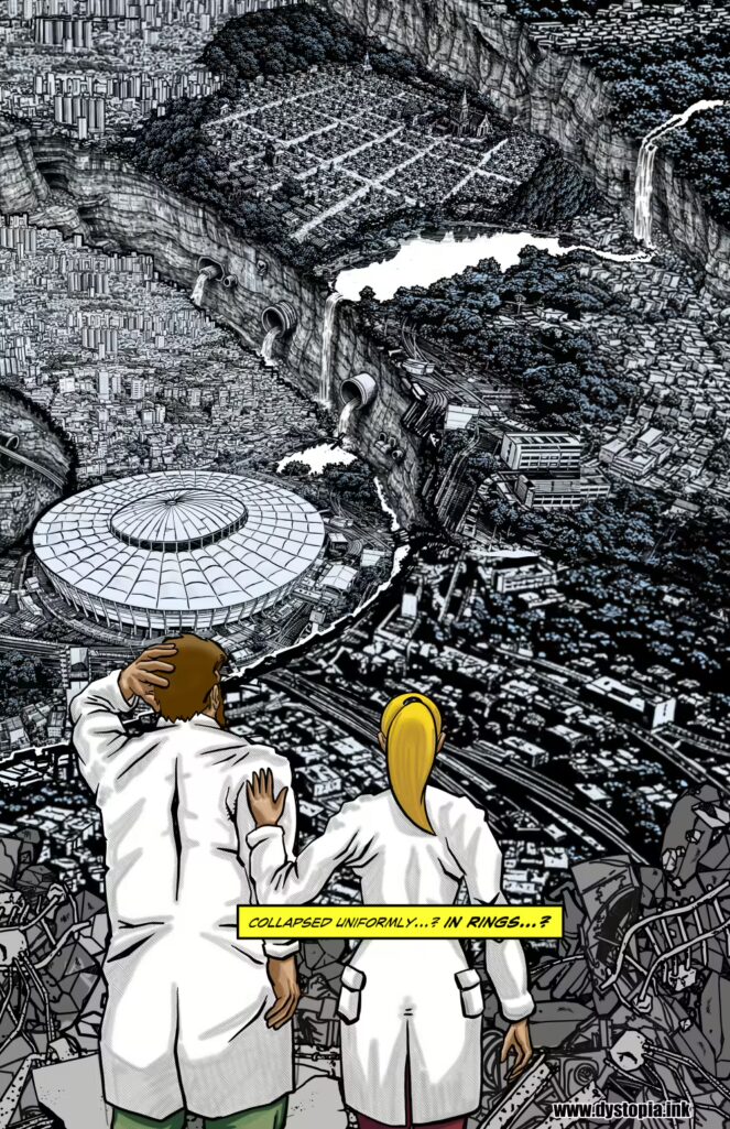 This week's page from Dystopia pulls back to reveal the scale of the collapse of the city. What once felt like isolated instability now resolves into something structured… a pattern etched into the city itself. The composition opens wide, emphasizing both distance and design, as the collapse reveals a form that raises more questions than it answers.