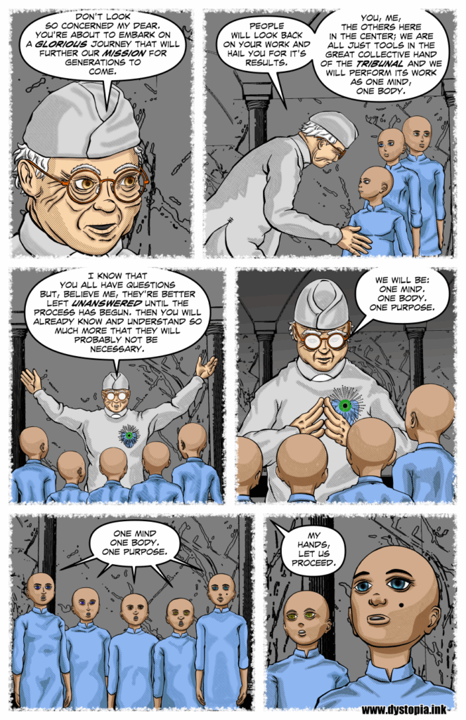 Creative notes: This week’s page, Dystopia: Chapter 2 – Midwife, Aborted, Page 24, steps back in time with a haunting flashback that explores the origins of Angie’s indoctrination. The scene brings us inside the Tribunal’s stone-walled caverns — a simple, ritualistic space that merges scientific authority with religious reverence.